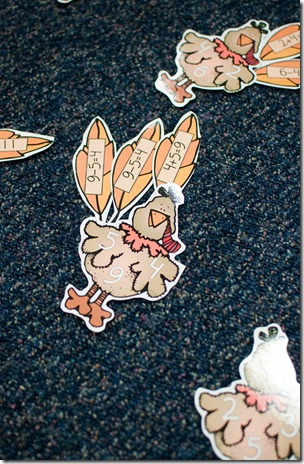 This is a little addition & subtraction activity where the kids have to solve the problem on the turkey’s belly and add the number of feathers to show the sum/difference. They kids LOVE the feathers :)